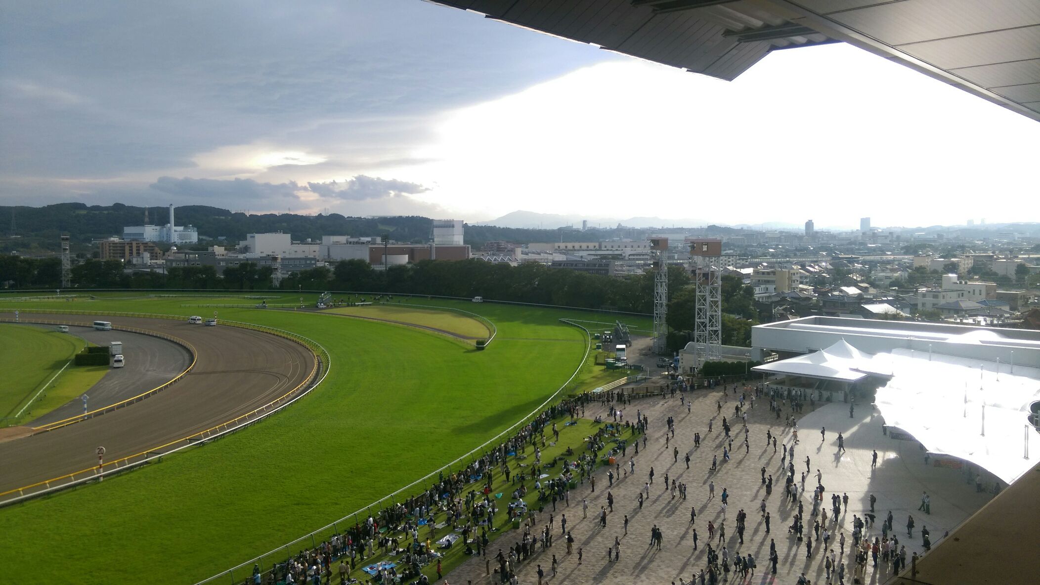 写真はメイン発走直前、ラウンジからの眺望。夕日までには至らない陽射しがくもり空と上手にマッチしておりました。