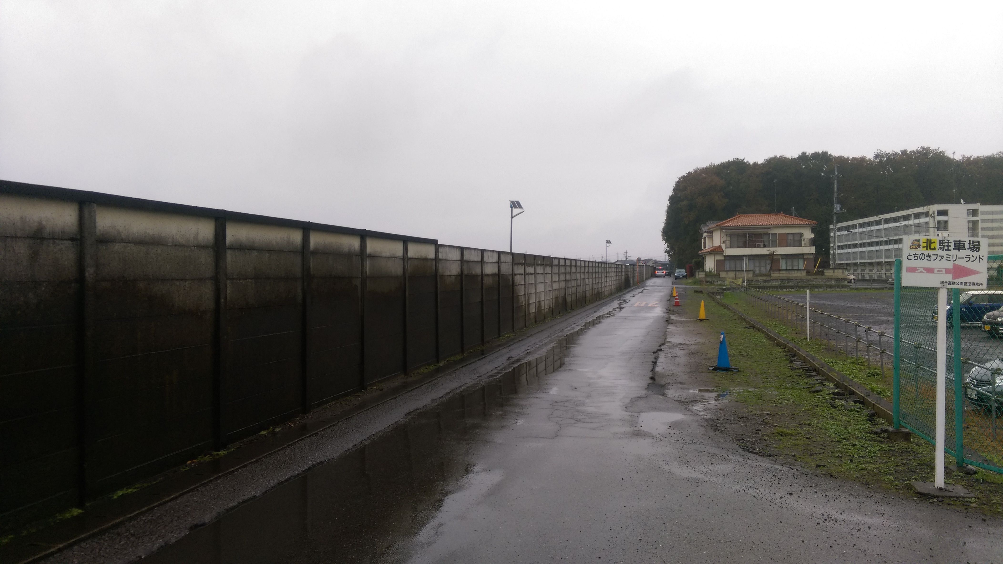 しっかり自覚してからあわててUターン、西川口駅を越えて跡地方面へ車を向けました。ナビには楕円形をした道路が見えていましたのでそこを目指して。実際その道はコース跡ではなく、敷地を壁で囲んだ外周道路。ギリギリ車がすれ違えないくらいの幅でしたので、向こうから来るなーと思いながら周回していきました。