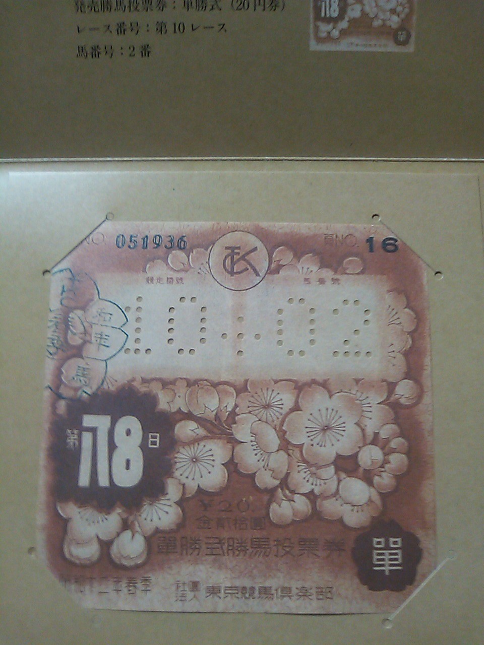 20円の馬券でした。台紙には当時のラーメン1杯が10銭程度という