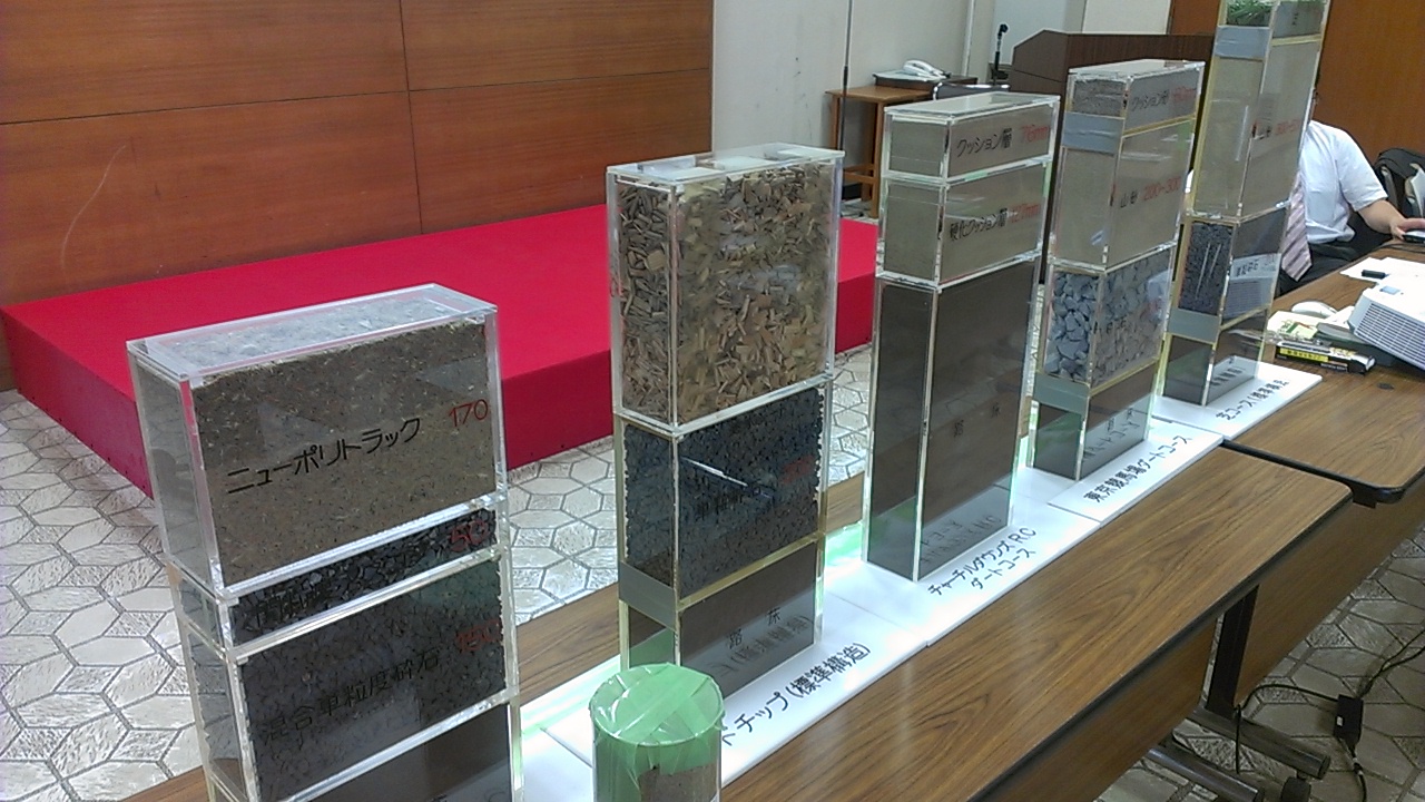 ダート馬場の作り方の紹介も非常に面白く。路床と呼ばれるベース部分を転圧→砕石を敷く→山砂を敷く→クッション砂を敷く(現在は9cmで調整とのこと)、という手順だそうです。他にも、日本は雨が多いため、排水の目的からクッション砂を採用していることや、馬が跳ね上げた際に目に入っても大丈夫なように粒子が丸くなっている、などなど。現場では馬場の模型を用意してくれまして、アメリカはチャーチルダウンズの馬場構造などと目視で比較できました。以下はその写真です。左から順に、ニューポリトラック、ウッドチップ、チャーチルダウンズダートコース、府中ダートコース、芝コースです。