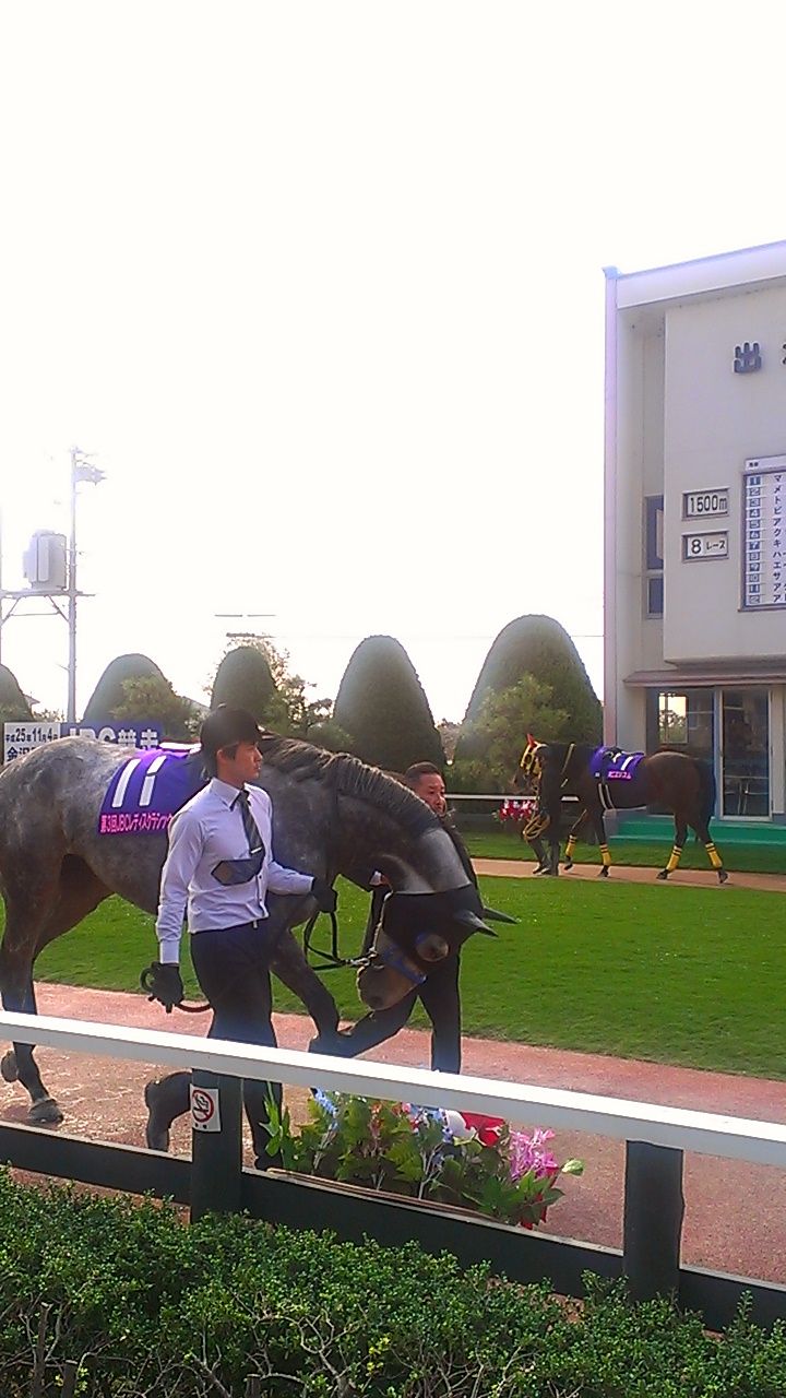 到着してすぐのレースの返し馬の音。半ば水の表面を叩いているようなパチッパチッとした蹄音。砂質が独特という話も書いてあったように記憶していますが(すみません、いま手元になくて)なんというか、砂に保水力があるといいますか。ジャリとした感じと相まって、脚抜きのよさとはちょっと違う、波打ち際の砂のような印象でした。昼まで陽がでませんでしたので、このまま不良馬場だろうなとも思っていました。